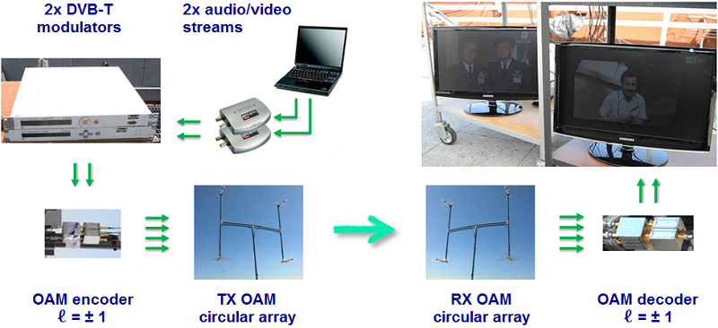 The possibility of exploiting the OAM in radio communications has been deeply investigated at RAI-CRIT, in collaboration with the University of Torino, Department of Physics, by means of several numerical studies, experimental analyses and theoretical considerations [4-9]. Focusing on free-space radio transmissions between antenna arrays, a formula for the link budget estimation, which generalizes the Friis equation to the case of OAM communication links, has been derived [5,6]. This expression turned out to be very useful for the characterization of the experiment realized at RAI-CRIT, where an OAM multimode transmission of DVB-T signals between facing Uniform Circular Arrays (UCAs) has been successfully performed, showing a sufficiently good mode insulation over a distance longer than three times the far-field range [7,8]. In particular, two different TV streams with high-definition (HD) audio/video programs, previously stored on a PC, were sent to two DVB-T modulators, where a 16-QAM modulation scheme with code rate 3/4 was adopted; then, the two signals were simultaneously encoded as OAM modes with indices l = 1 and l = -1 by means of a properly designed OAM encoder, and transmitted through an UCA made of four Yagi-Uda antennas. At a distance of 40 m from the transmitting array, a receiving OAM decoder allowed the discrimination of the signals by separating the OAM components and sent them to two identical commercial DVB-T receivers. In correspondence of an optimal antenna pointing, the insulation between the two OAM channels was estimated around 15 dB, thus allowing the simultaneous and correct reception of the two TV programs.